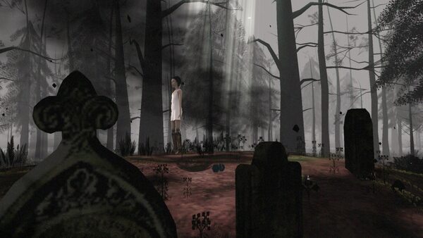 The Path использует иную стратегию: приглушенные темные оттенки, размытые границы и акцент на красном как символе опасности.