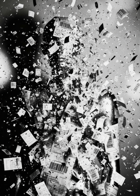 Я печатаю холодную ленту, бледную, как выцветшая память. Цифры бегут по ней, не оставляя смысла. Никто не читает. Никто не слушает. Едва родившись, мои друзья падают в урну — тихо, без прощания.