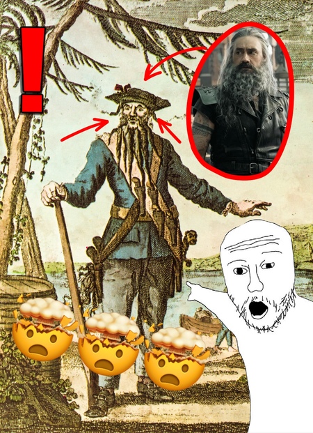 Ещё один интересный пример историчности против романтичности: в хитовом на западе сериале «Наш флаг означает смерть» появляется множество персонажей с историческими именами: Эдвард Тич, Стид Боннет, Израиль Хэндс, Бенджамин Хорниголд, Энн Бонни, Мэри Рид. И, конечно, все из них до последнего являются лишь выдумкой, «основанной на», носящей имя настоящего человека, но забавные детали начинают всплывать, когда авторы сериала пытаются «опровергнуть» некоторые мифы о том или ином пирате. Например, в первой же серии, в которой зритель знакомится с Чёрной Бородой — Эдвардом Тичем, он показывает в книге на гравюру самого себя, изображённого с дымящейся бородой и девятью пистолетами за разными поясами. Персонаж «Эд» Тич причитает о том, как это нереалистично, что у него вовсе не дымится борода, и что девять пистолетов это попросту глупо и чрезмерно «вот, у меня один пистолет, один нож — как у всех!» — говорит герой.