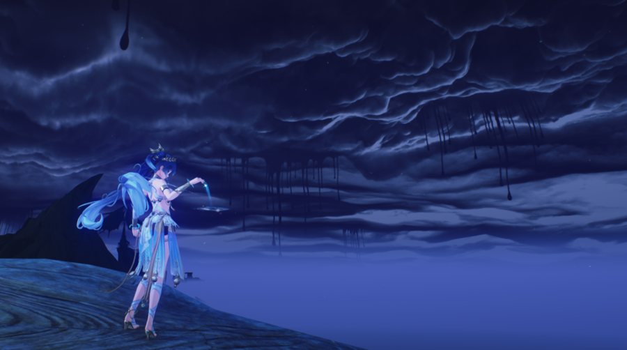 «Сначала это была всего лишь капля дождя. Она вырвалась из тисков гравитации и упала в небо, но затем последовал идущий снизу вверх ливень, очистивший мир. „Буря“ унесла всё, оставив лишь диссонанс мелодии времени» — так описан Шторм на одном из загрузочных экранов.