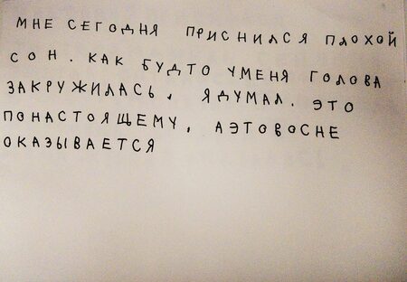 В 2018 году проект провел групповую выставку «Мне сегодня приснился сон» в библиотеке «Семеновская»: пять художников представили свои работы, сопровождаемые текстами Вадима Дермана, одного из участников, который «описывал» представленное на выставке через рассказ о своих снах. Организаторы делают акцент на «сновидческой природе»[7] художественных практик авторов, живущих в интернатах: воплощением того, что кажется недоступным и ускользающим.