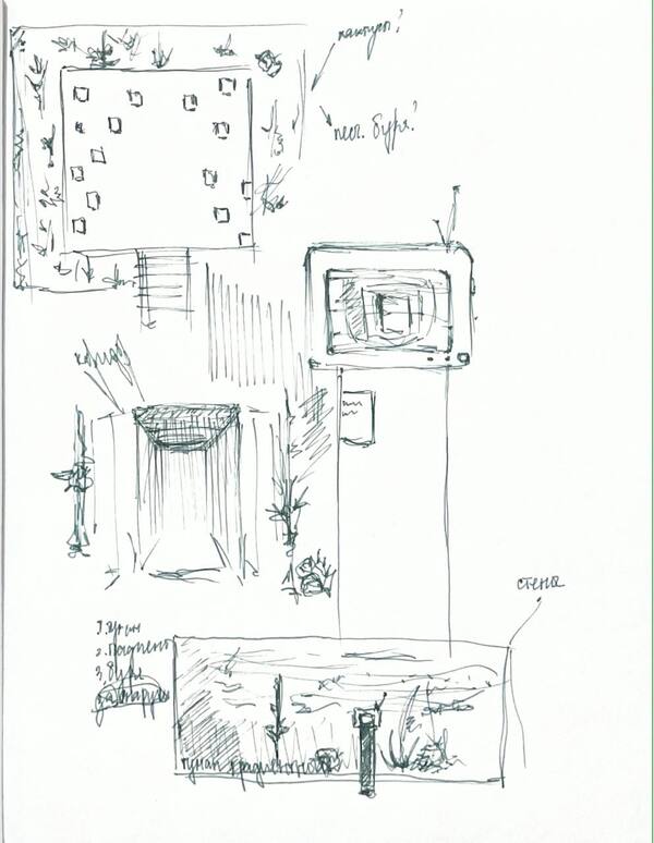 снаружи, за прозрачной оболочкой, зрителя окружает земля, грязь, песок, ландшафты, что, соответственно, отражает мир вне, неидеальный, первостепенный.