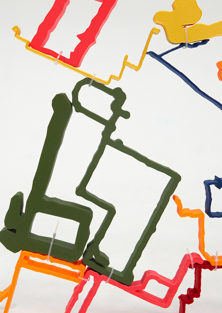 Виртуальные записи маршрутов нашли свою интерпретацию в виде материальных деталей. Проходя через фазу настройки, художница искала в маршрутах баланс.