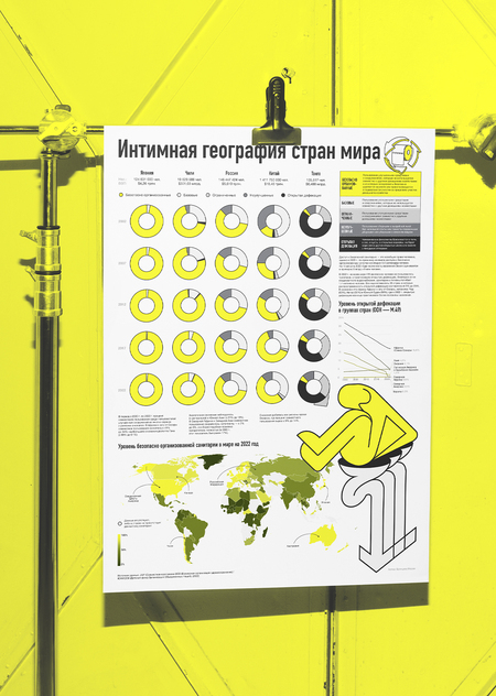 Круговые диаграммы создают образ рулонов туалетной бумаги и помогают зрителю быстрее проникнуться темой проекта. Также плакат дополнен тематическими иллюстрациями, но без детальных подробностей.