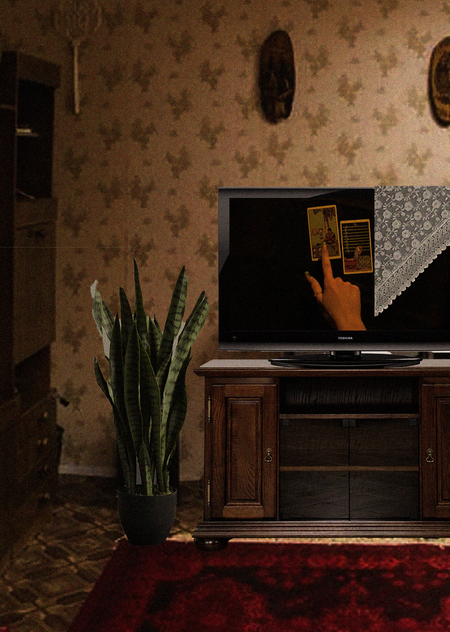 МИМЕЗИС: женщина от первого лица делает таро-расклад, но ее расшифровки мы не слышим, вместо них аудио новостей без конкретики.
