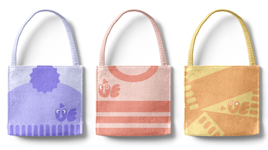 Ideogram: Make a realistic photography of Bags from the brand shop that sales clothes for yeti. There should be differently sized shopping bags. All the bags should be in soft blue, pink and white colors, and should have a pattern made of mountains as their design., photo, cinematic, poster, product, 3d render