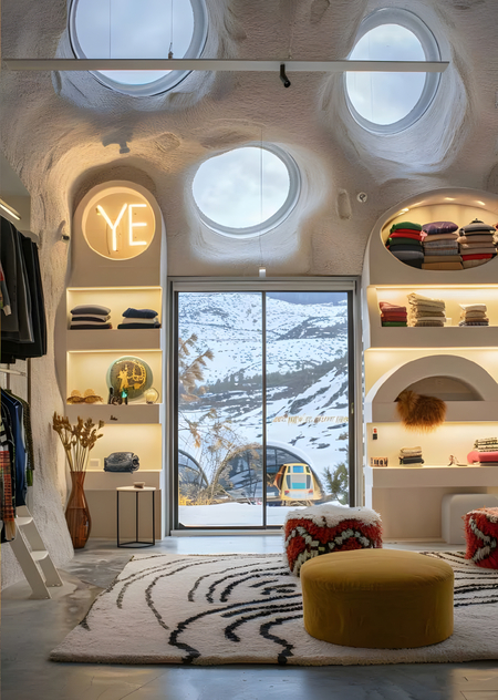 Midjourney: modern interior design, with the sign on the top that says «YE"an organic shaped room made of white clay walls with built-in and wardrobe with a lot of warm clothes inside, inspired in the style of gaudi, in the windows we can see snowy mountains in the style of Gaudi --ar 16:9
