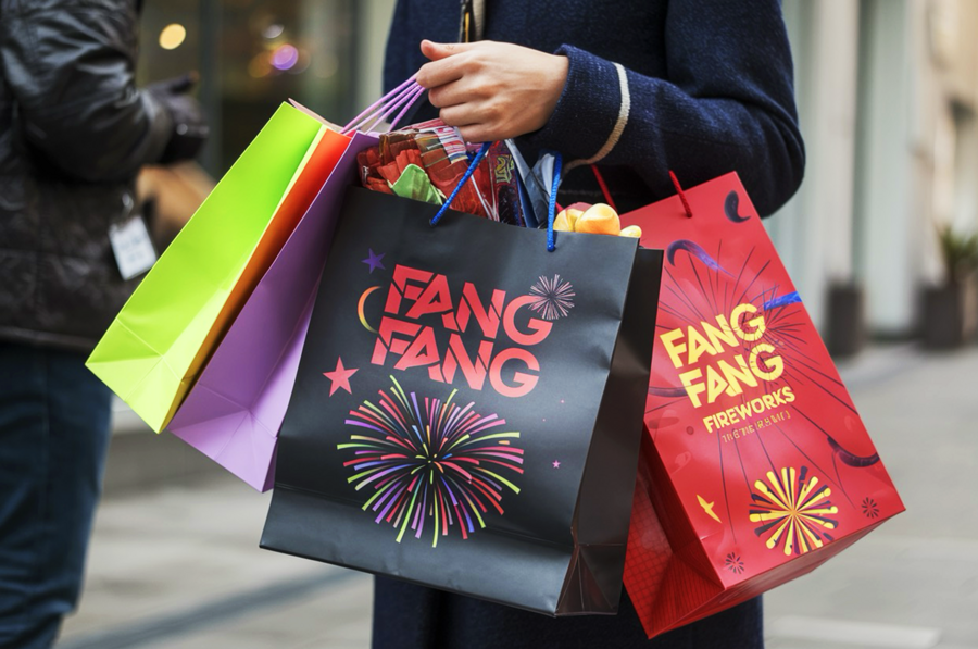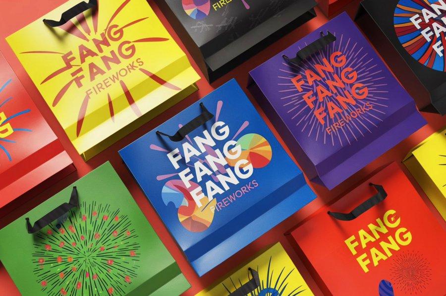 /imagine prompt: generate a variety of shopping bags with fireworks for the FANG FANG fireworks brand using bright and neon colors. Shapes should be very simple and geometric, show different types of fireworks