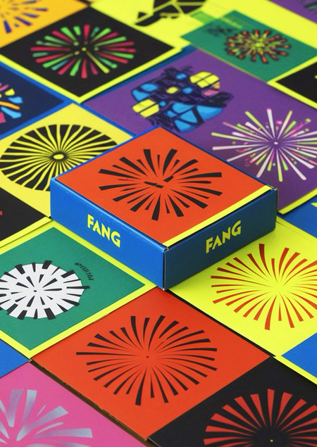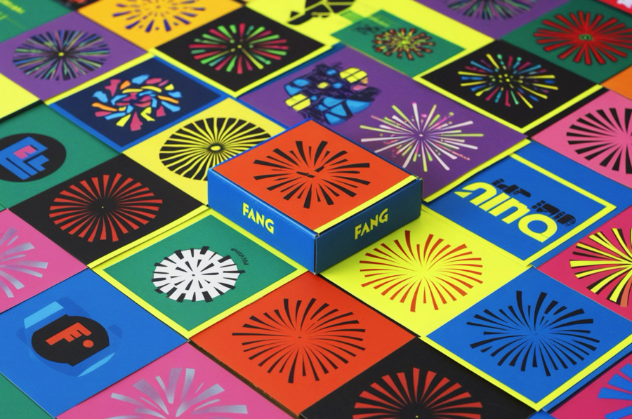 /imagine prompt: generate a business card for the FANG FANG fireworks brand using bright and neon colors. Shapes should be very simple and geometric, show different types of fireworks.