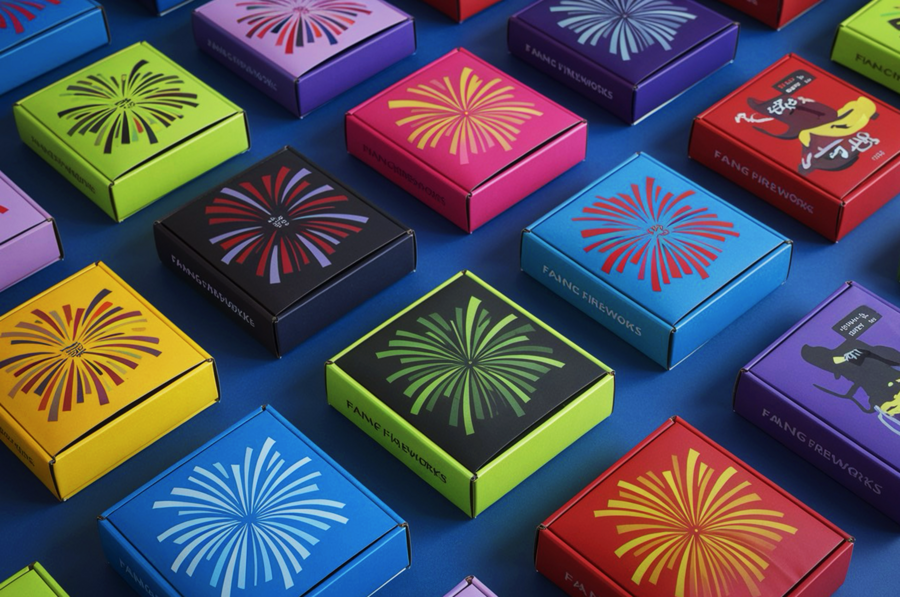 /imagine prompt: generate a variety of fancy boxes with fireworks for the FANG FANG fireworks brand using bright and neon colors. Shapes should be very simple and geometric, show different types of fireworks