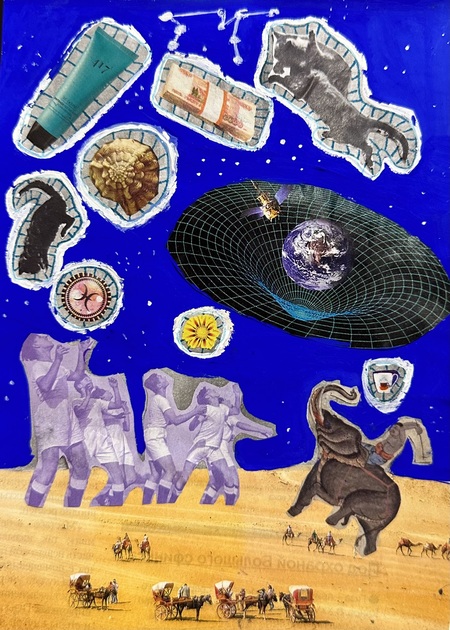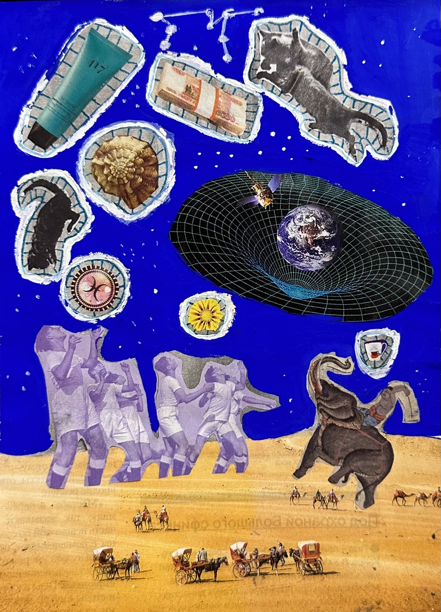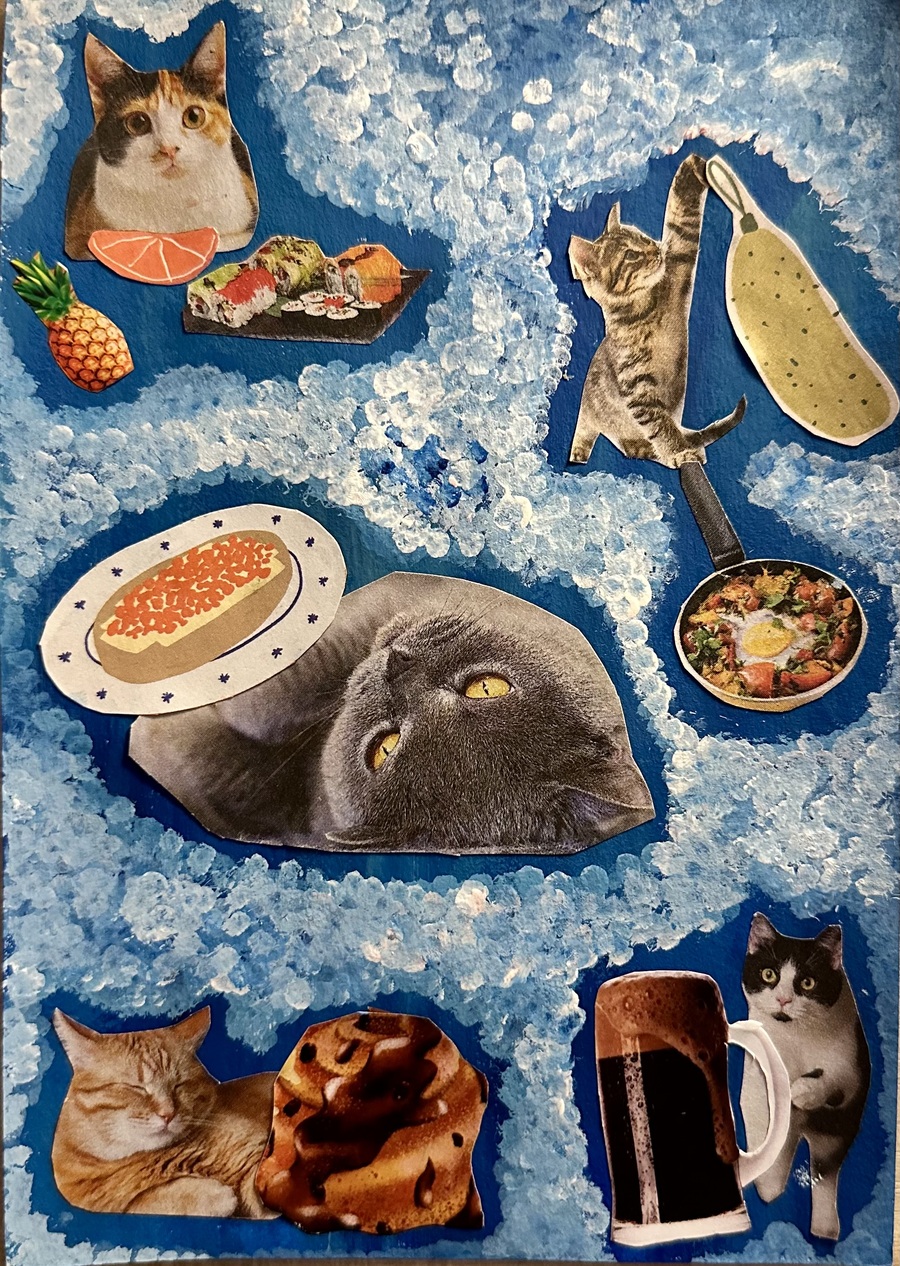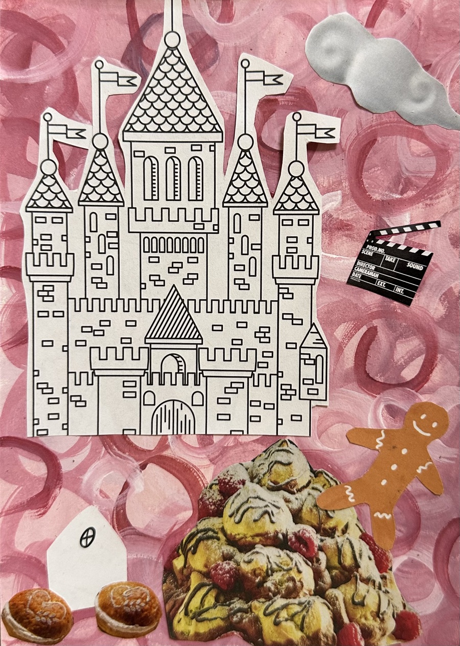 Дано: журналы, раскраски и газеты разных тематик и форматов. Нужно: найти самые яркие объекты, соединить их одной идеей, создав яркий и интересный коллаж. В работах я отобразила хаотичные сценарии снов. Никогда не предугадаешь сценарий снов так же, как и я не могла заранее представить как соединятся столь разные элементы в одной композиции