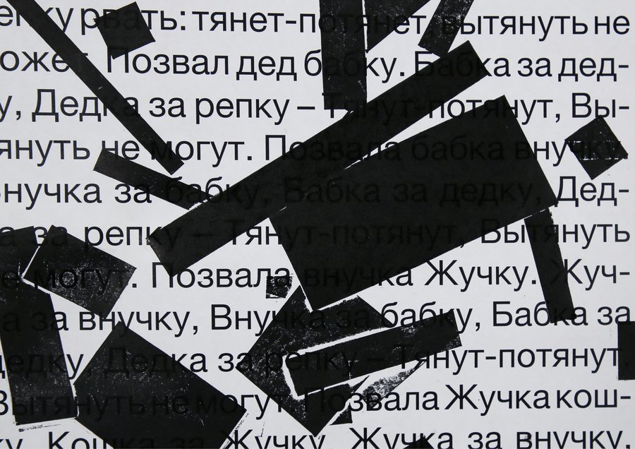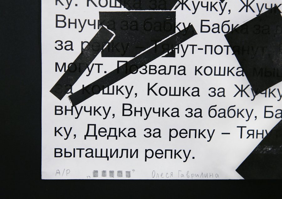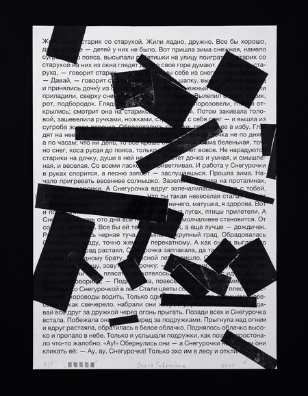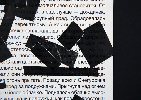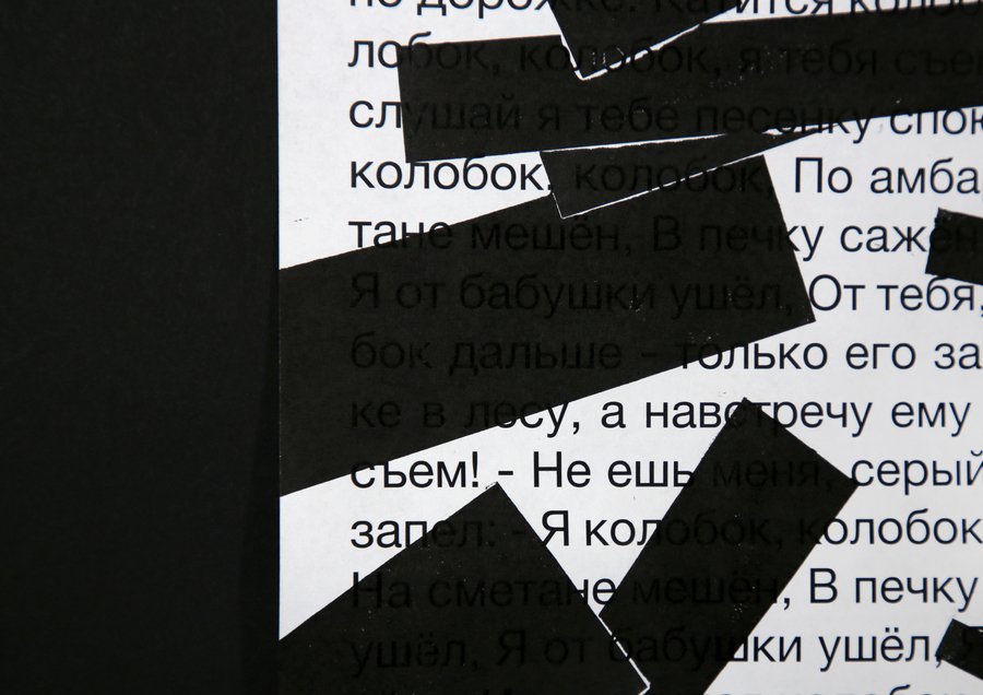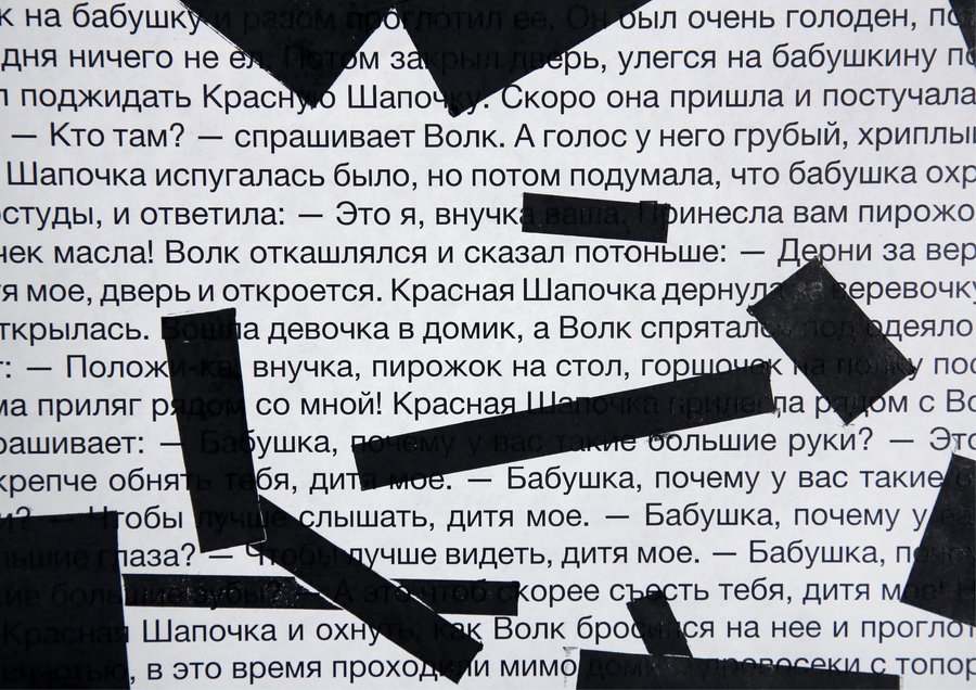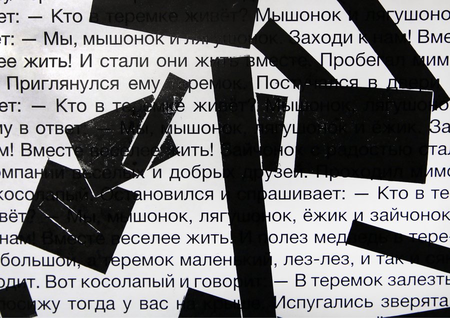 На лист с текстом я бросаю прямоугольные формы — плашки цензуры. Там, где форма случайно падает, я делаю отпечаток. Таким образом, «запрещённые» фрагменты определяются не смыслом, а случайностью. Цензура превращается в слепую механику вмешательства. В работе я использую тексты детских сказок. Их очевидная невинность делает акт цензуры особенно абсурдным. Когда скрывается простая сказка, зритель начинает искать тайный смысл. Цензура становится создателем значения.