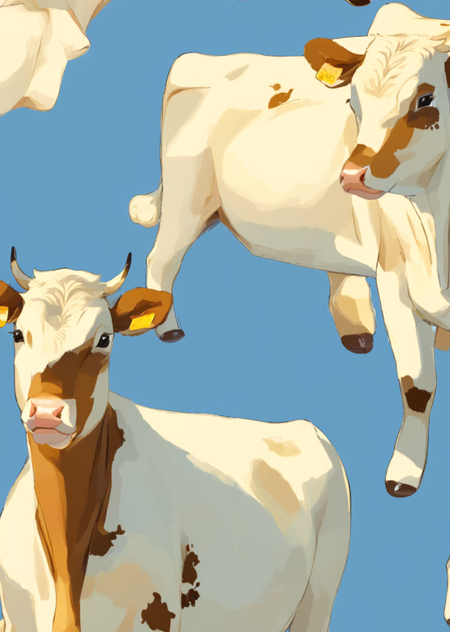 В финальных изображениях получилось передать настроение, которое закладывала автор в свои работы — все иллюстрации получились нежными, аккуратными, в каждой прослеживается отличительный голубой фон и единый силуэт коровы, которая находится как бы не в окружении чего-то, а сама по себе. Также стоит отметить цвета и оттенки — модель переняла цветовые и световые решения и иллюстрации получились в мягких тонах, при этом легкий акцент всё ещё присутствует.