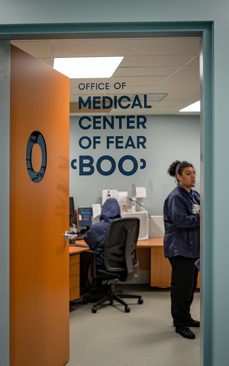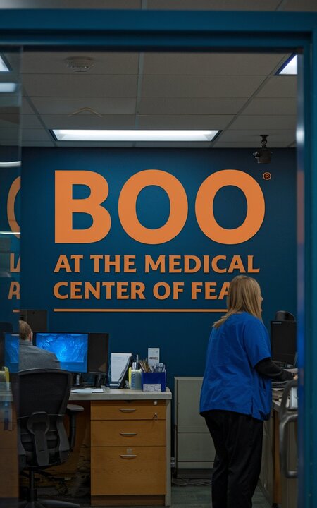 9. office of Medical Center of Fear «Boo» with two o inside, an open orange door is inscribed in one of the letters o, font Halis Rounded SC Medium, other letters are dark blue 10. office of Medical Center of Fear «Boo» with two o inside with emloyees, an open orange door is inscribed in one of the letters o, font Halis Rounded SC Medium, other letters are dark blue 11. T-shirt with logo of Medical Center of Fear «Boo» with two o, orange door and dark blue letters 12. Hat with logo of Medical Center of Fear «Boo» with two o, orange door and dark blue letters 13. bathrobe with logo of Medical Center of Fear «Boo» with two o, orange door and dark blue letters 14. phone case with logo of Medical Center of Fear «Boo» with two o, orange door and dark blue letters 15. Cap with logo of Medical Center of Fear «Boo» with two o, orange door and dark blue letters 16. merch with logo of Medical Center of Fear «Boo» with two o, orange door and dark blue letters 17. tote bag with logo of Medical Center of Fear «Boo» with two o, orange door and dark blue letters