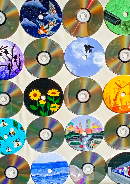 Используемые материалы: компакт-диски, деревянная доска, акриловые краски и листы.