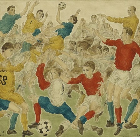 промпт: 1 — a painting of football, 2 — a painting of intelligent dinosaurs