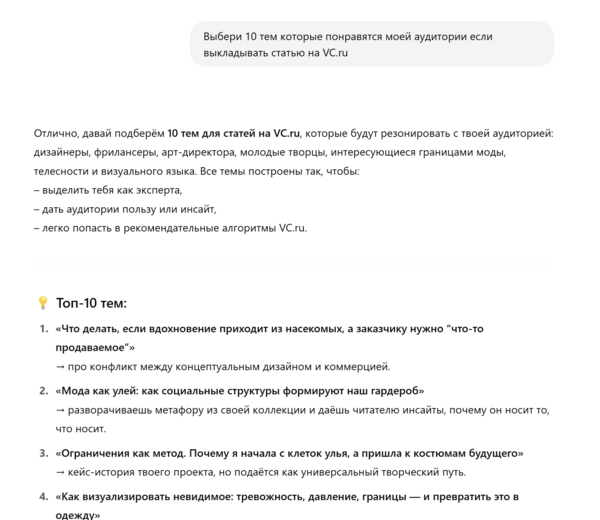 На основе анализа вовлечённости (по реакции, комментариям и структуре материала) мы составили список из десяти потенциальных тем, способных «зайти» широкой дизайнерской и маркетинговой аудитории. Каждая тема была оценена по шкале от 1 до 5 — в зависимости от потенциальной виральности. После этого мы совместно написали структурированный текст статьи в стиле VC.ru, включив в него ключевые слова и подходящий SEO-блок.