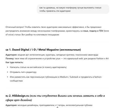 Первым этапом работы с нейросетью стало поиск тем и форматов публикаций, которые максимально соответствуют интересам целевой аудитории на разных платформах.