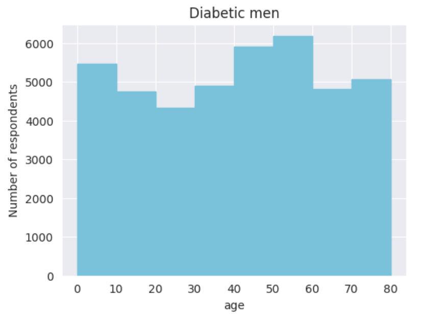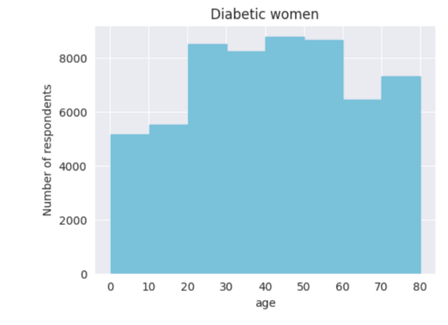 ax1.hist (female_df['age'], bins=8, edgecolor='#ab3a3f', color='#ab3a3f') ax1.set_title ('Diabetic women') ax1.set_xlabel ('age') ax1.set_ylabel ('Number of respondents')