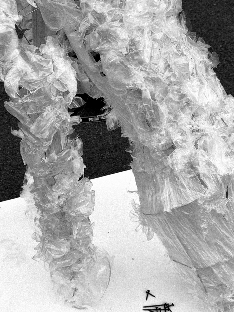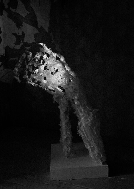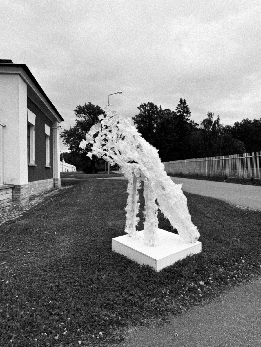 Исчезающая лошадь из проволоки и расплавленного пластика символизирует гибель животных на территории фермы во время войны.