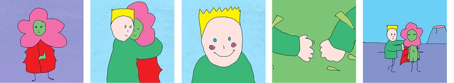 Особенности визуального стиля исходного датасета: простая графика, черный однородный контур, плоская заливка без обозначения объемов; анатомия персонажей очень условна, а общая цветовая палитра характеризуется ограниченным сочетанием цветов.
