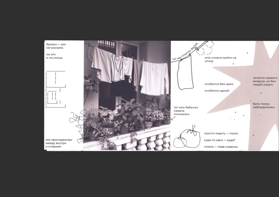 это серия коротких текстов, наблюдений и изображений, которые складываются в атмосферу повседневной жизни на балконе. в этих заметках я делюсь личным опытом: какими вещами окружена, что слышу, что замечаю. мне важно передать ощущение интимности, даже если речь идет о пространстве, которое открыто для всех.