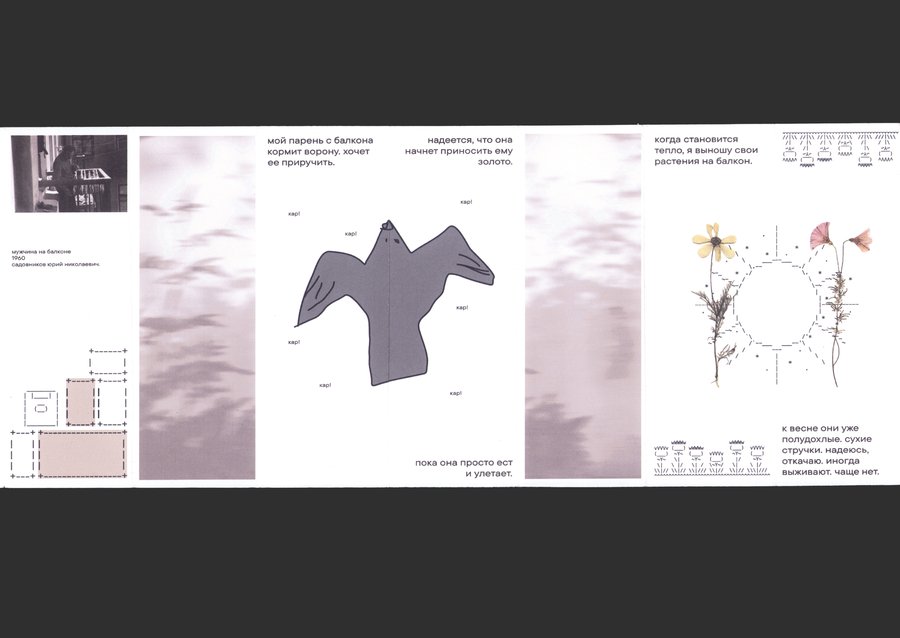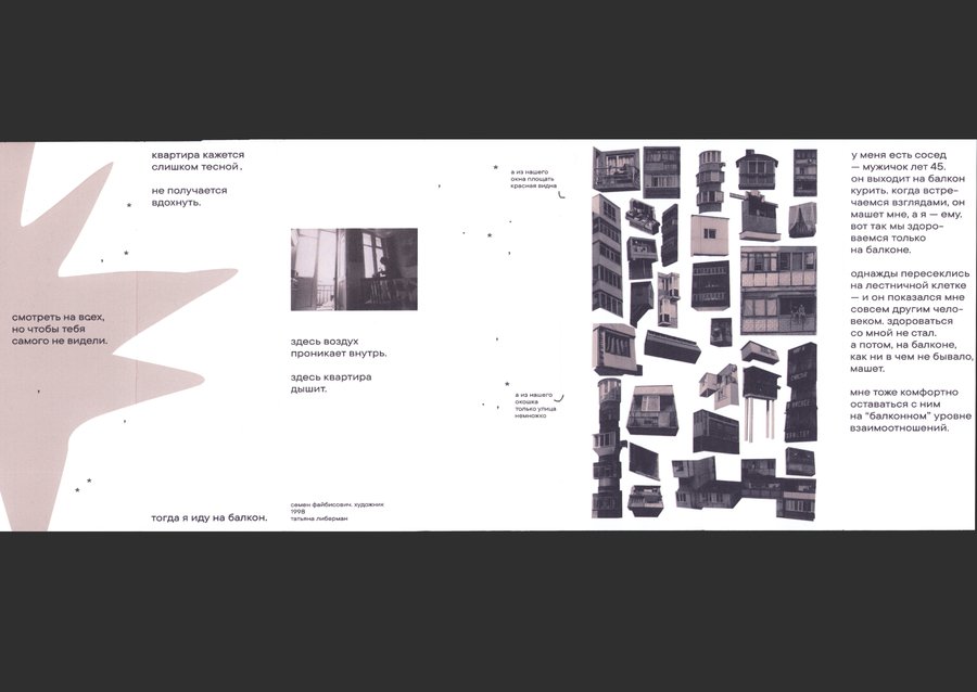 - короткие заметки о балконах: наблюдения, детали, истории. - рисунки в стиле ascii, которые изображают предметы с балкона, создавая ощущение простоты и узнаваемости. - фотографии из архива «история россии в фотографиях» (серия «балконная жизнь»).