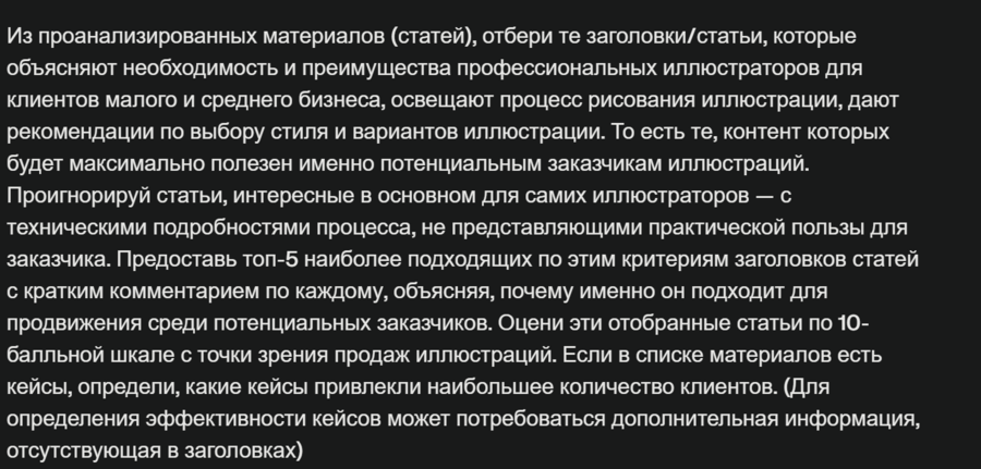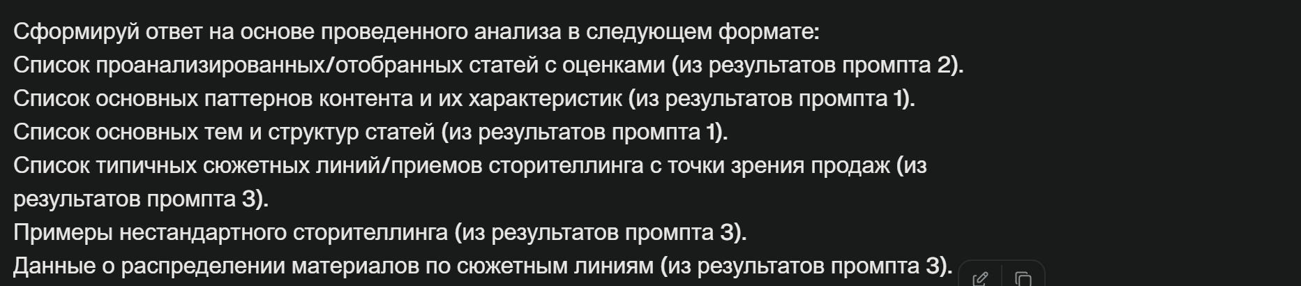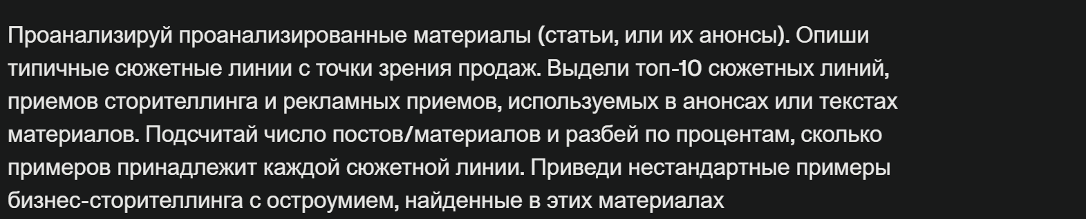 После того, как нейросеть выдала мне по 10 примеров статей с двух сайтов, я попросила ее их проанализировать с помощью этого промпта: