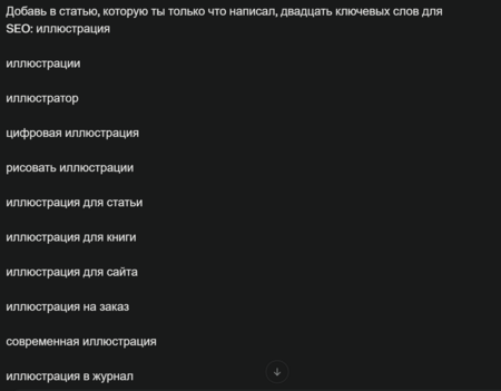 После написания статьи и зашла в Яндекс Вордстат и нашла 20 ключевых слов по теме «Иллюстрация», а после попросила нейросеть включить их в ранее написанную статью