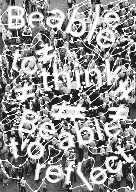 «Возможность думать не эквивалентно возможности размышлять» — главный посыл плаката, который изображает несознательную взаимосвязь людей в толпе, где эти два разных понятия особенно притупляются.