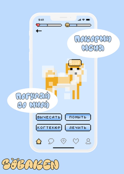 Фирменный стиль и дизайн приложения для поиска хозяев для совместных прогулок с собаками и отслеживания здоровья и настроения питомца в формате тамогочи.