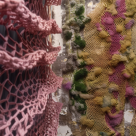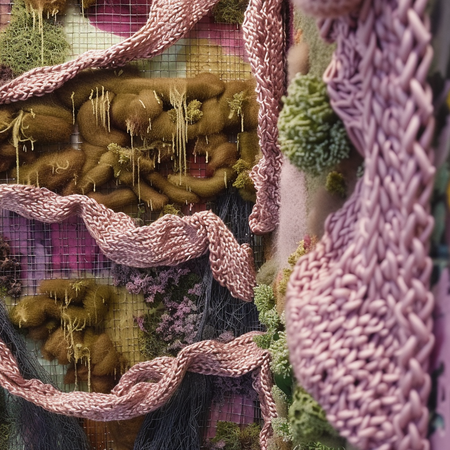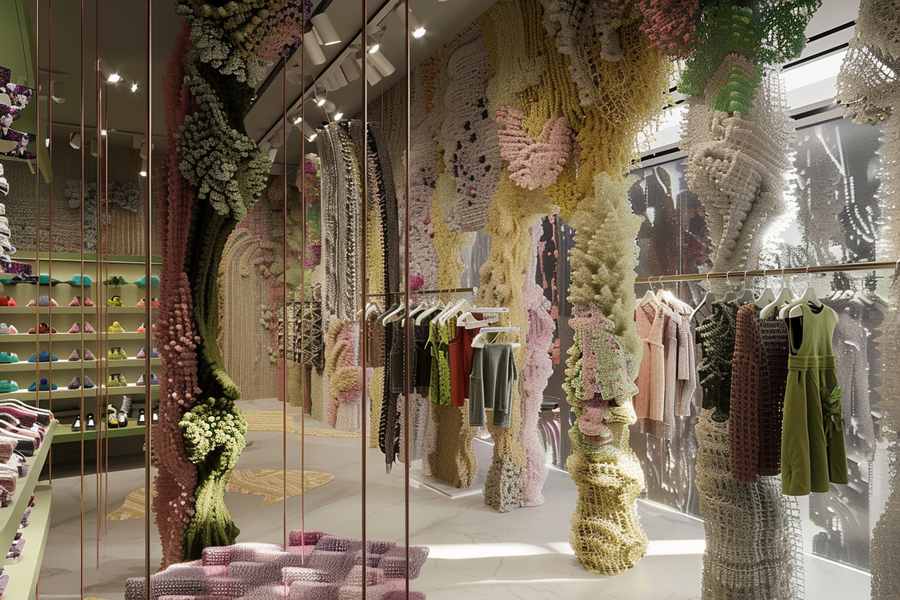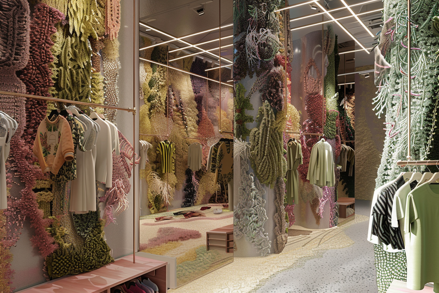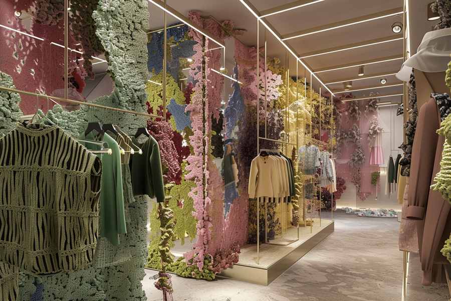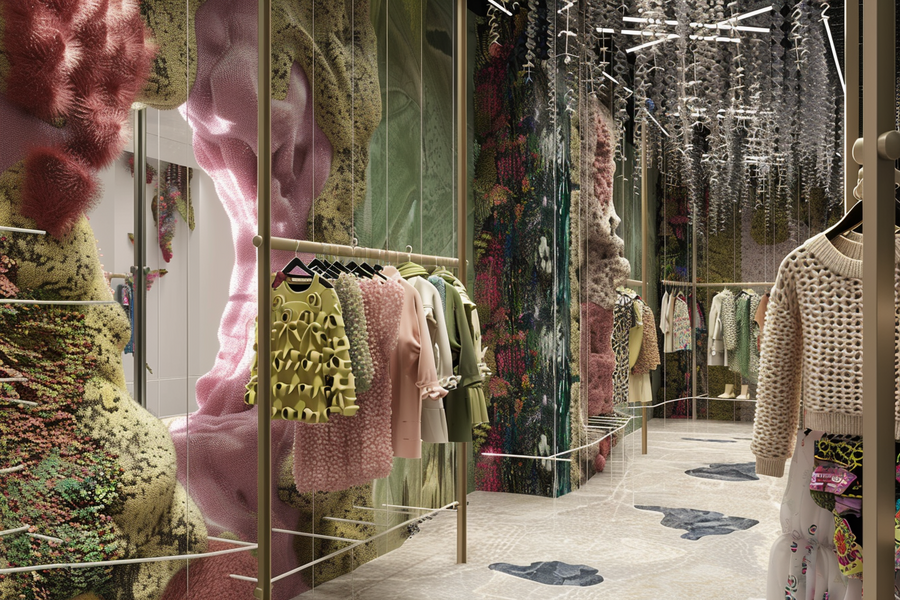 Promt: a stunning 3D render of a spacious clothing store, the walls are lined with panels of different materials and textures that resemble multi-colored moss. Along the perimeter of the walls there are rails with knitted clothes