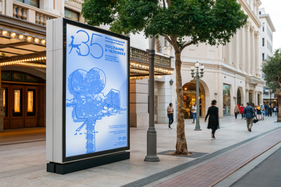 Плакат посвящён истории кинофестиваля. Путь, который прошло это послание за 35 лет, отражается в нас и сейчас, как отражается луч проектора от стены. Мне важно было показать, что сейчас мы смотрим в будущее именно из настоящего и прошлого. Выстраиваем новую реальность, основываясь на опыте предыдущих поколений.