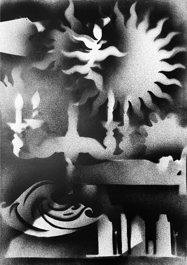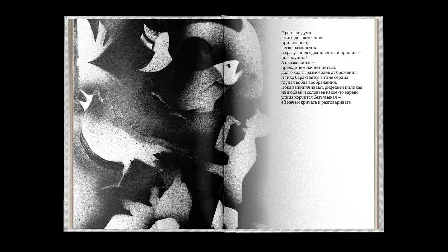 В поэме «Облако в штанах» лирический герой Владимира Маяковского противопоставляет себя окружающему миру. Обладая мягкой, возвышенной душой, он вынужден жить среди обыденности и неглубоких людей. Я решила показать это противостояние с помощью мягких и в то же время резких силуэтов, соединяющихся между собой.