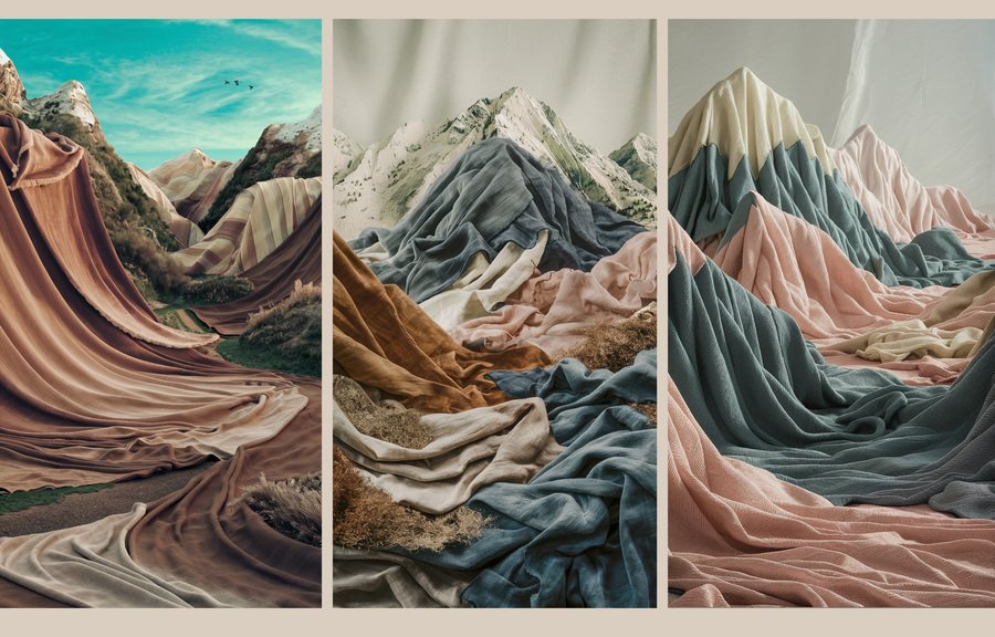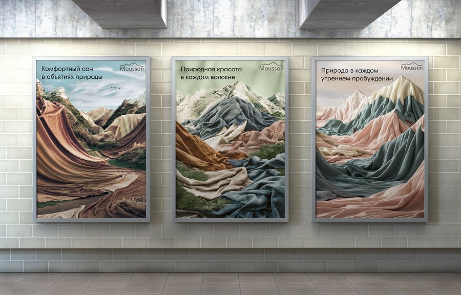 Для плакатов в прошлом проекте я создавала коллажи из пейзажей и «рельефов» постельного белья. Этот прием помогает подчеркнуть природность и натуральность используемых материалов.