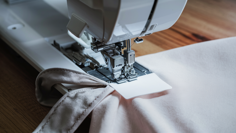 ideogram: close-up top view of a clean white sewing machine sewing a white rectangular label onto plain light-colored fabric, high-contrast, detailed