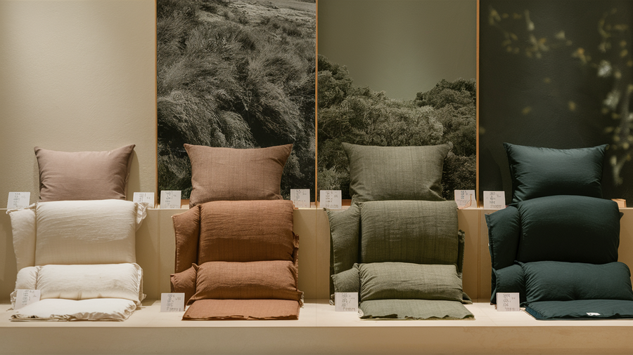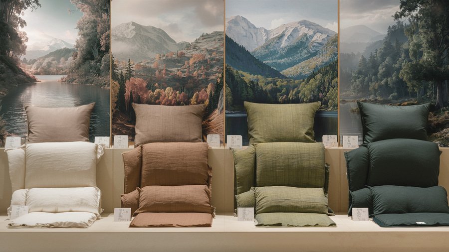 ideogram: A serene and earthy-toned display of bedding fabric swatches. The fabrics are neatly arranged, natural aesthetics, while the calming background of a serene, natural landscape