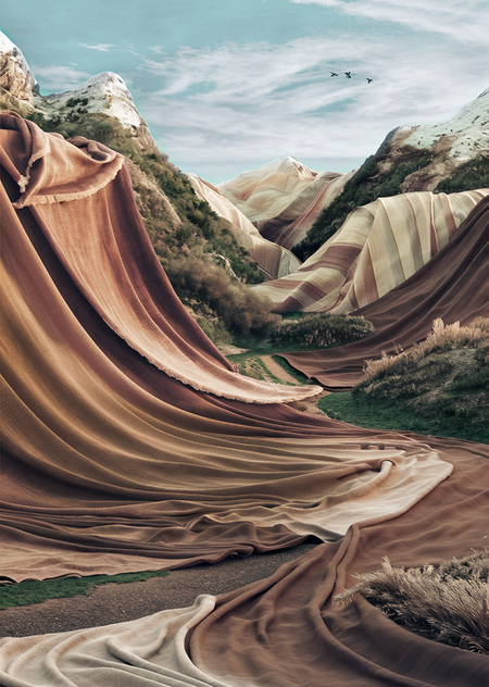 ideogram: breathtaking mountain landscape fabric with folds instead of mountains natural colors