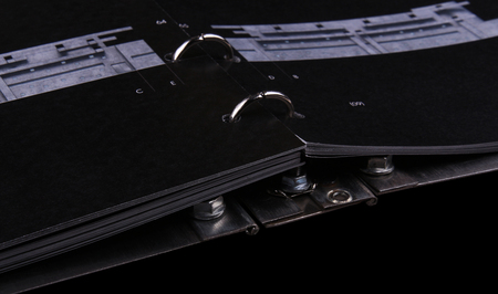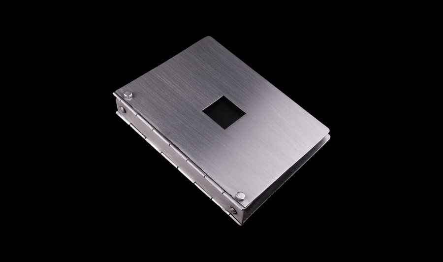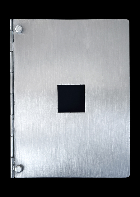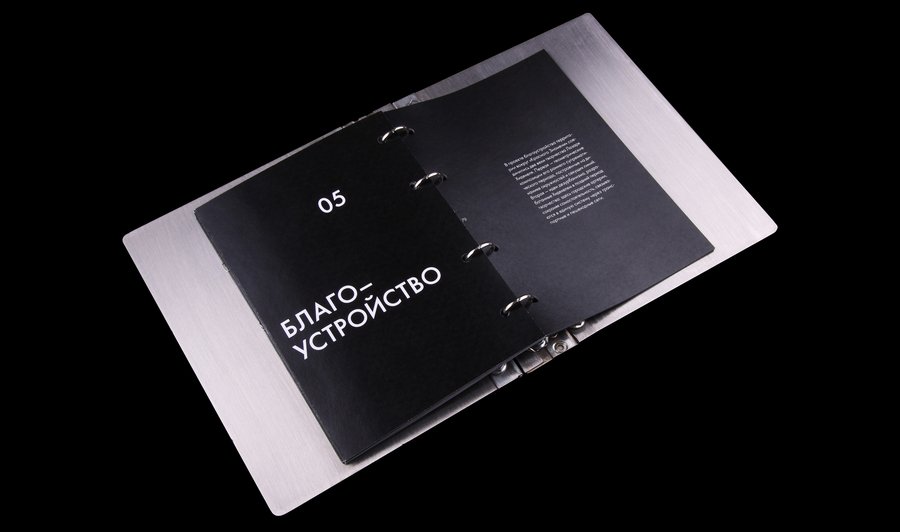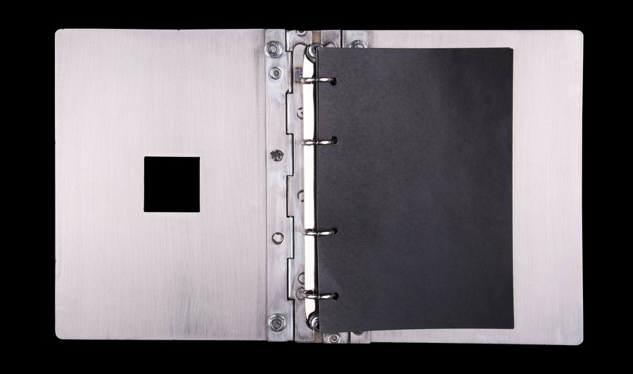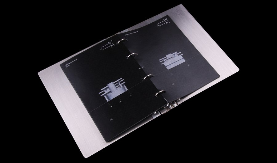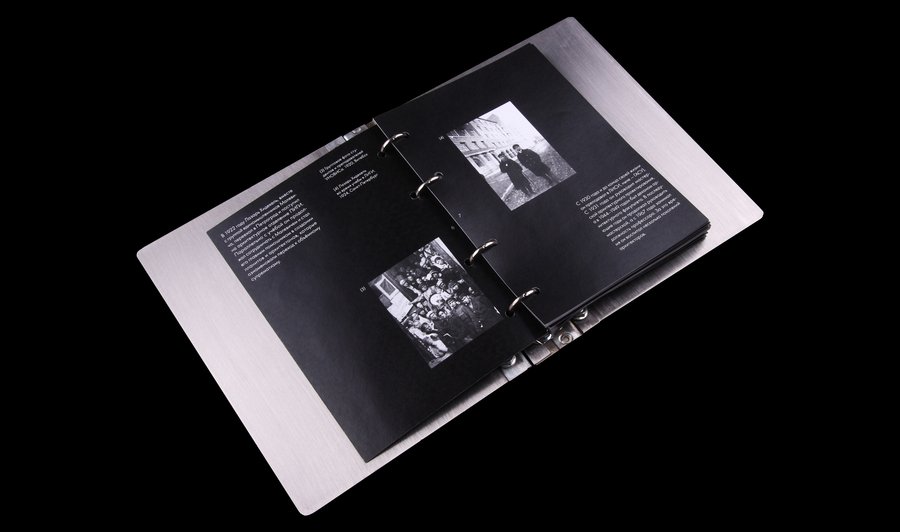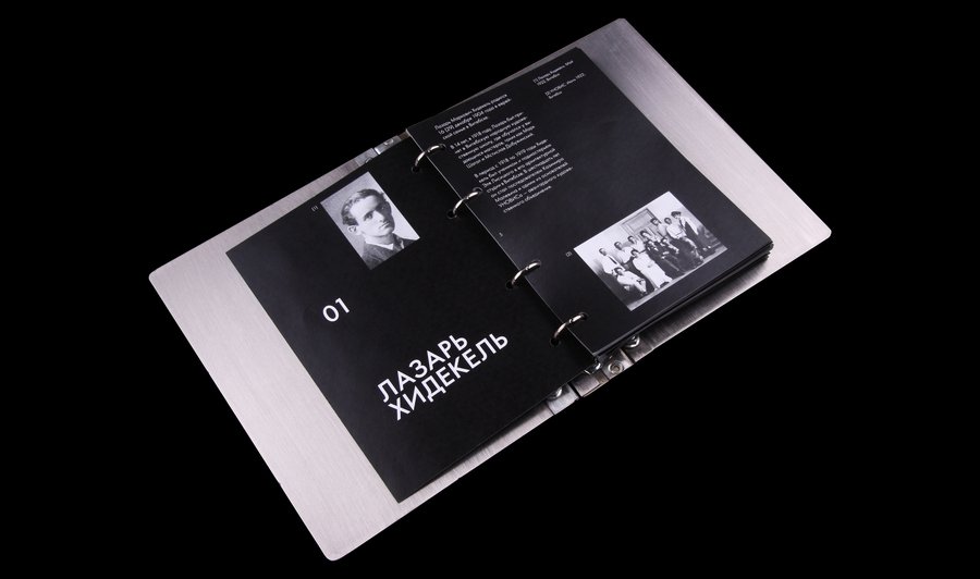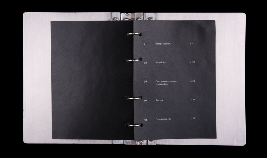 Книга-портфолио заключена в обложку из нержавеющей стали. Лазарь Хидекель был первым архитектором-супрематистом. Он не остался в плоскости эскизов и манифестов — он перенёс супрематизм в реальный мир, став мостом между абстракцией и физической архитектурой. Поэтому и обложка не бумажная, а сделана из материала, который используют в строительстве.
