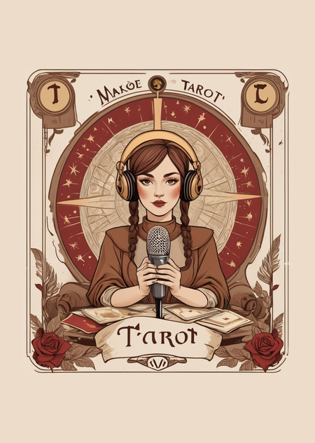 Prompt: A brown tarot card deck with small microphones and stars. There is a place for a logo on the deck. Solid white background.