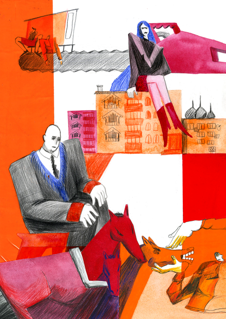 Сказка «Безногий и безрукий богатыри» отличается особой жестокостью. Даже счастливый финал кажется тревожным. Текст переосмысляется с точки зрения современной этики, и действие помещается в городской сеттинг. Работы выполнены в смешанной технике. чтобы подчеркнуть происходящий хаос