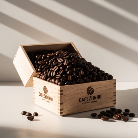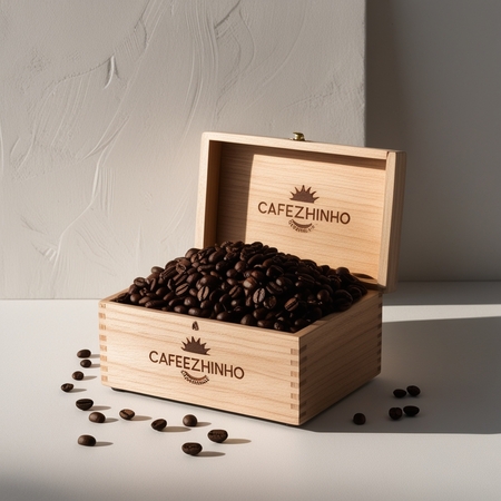/imagine prompt for a gift wooden packaging: Generate a gift wooden packaging for beans from the brand Cafezhinho. The name should stand out. The box is open and there are coffee beans inside. The background is neutral.