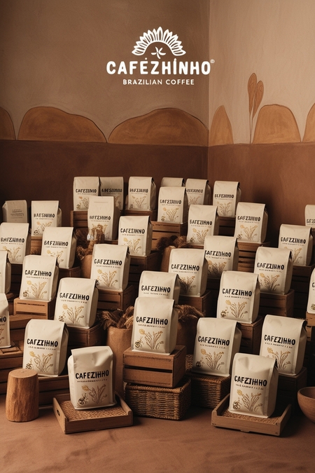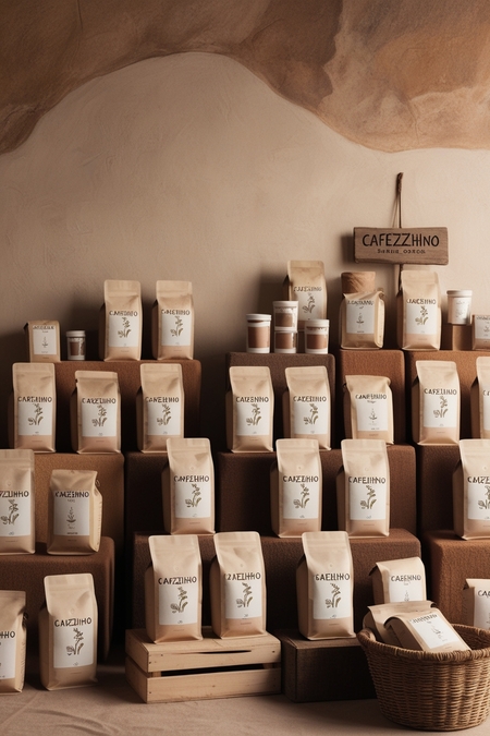 /imagine prompt for big packaging: Generate big packaging for a Brazilian coffee brand called «Cafezhinho», in a minimalist style inspired by cave paintings. The image shows many bags of coffee. The background is neutral and resembles a light clay cave.