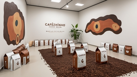 /imagine prompt for trading platform: Generate trading platform for a Brazilian coffee brand called «Cafezhinho», in a minimalist style inspired by cave paintings. The background of the room is white. The lining for the bags looks like handfuls of spilled coffee.