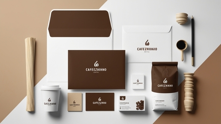 /imagine prompt for identity: Generate a layout of printed products (paper, envelope, business cards) on a white background for the coffee brand Cafezhinho in a minimalist style, inspired by cave paintings, using white, brown, beige and black colors.