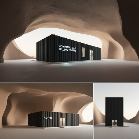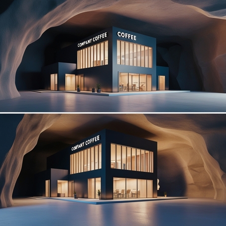 /image prompt for an office building: Generate an office building in which a company selling coffee operates. The building should look realistic and three-dimensional. The building should be in a cave style. Generate it from different sides.