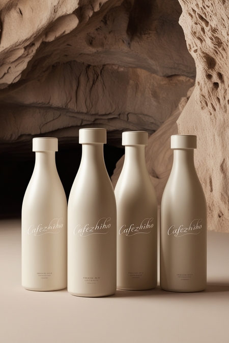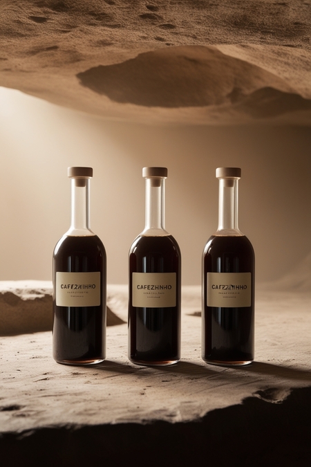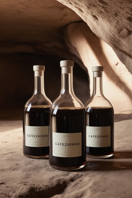 /image prompt for coffee bottles: Generate coffee bottles against a cave background. in light colors. On the bottle should be «Cafezhinho» logo in printed font. The coffee should be in the bottle.
