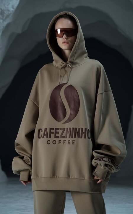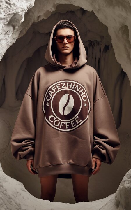 /image prompt for a hoodie: Generate a fashion photograph featuring a standing fullbody model wearing brown sunglasses and a large, oversized hoodie. The hoodie is adorned with a coffee logo for the Cafezhinho coffee brand. The background is deep, white. The overall atmosphere of the photo is edgy and luxurious. The logo is a coffee bean. The background should be a cave.