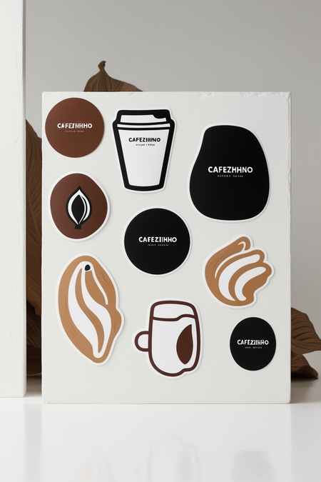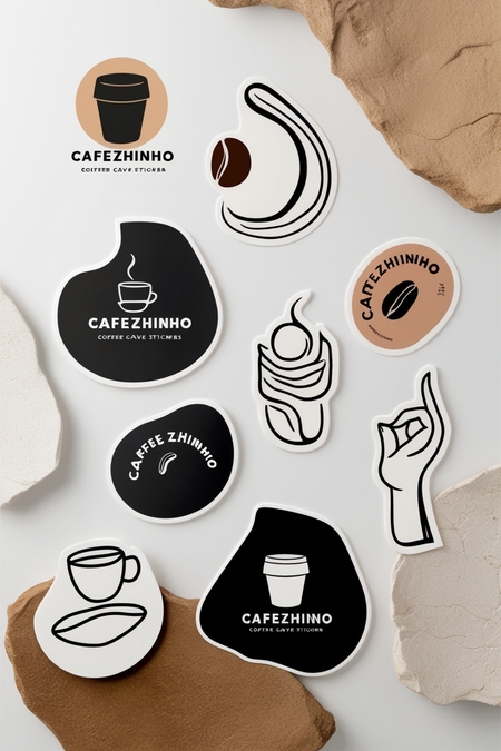 /imagine prompt for stickers: Generate a variety of interesting volumetric stickers for the for coffee brand CAFEZHINHO inspired by cave paintings in a minimalist style using black white brown beige colors on a white background.
