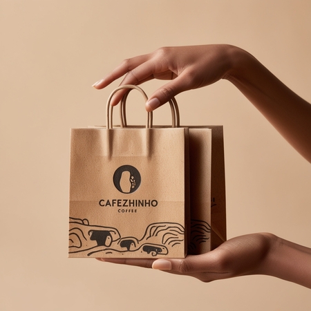 /image prompt for gift paper bags: Generate gift paper bags held by a female hand for the coffee brand Cafezhinho inspired by cave paintings in a minimalist style using black white brown beige colors.
